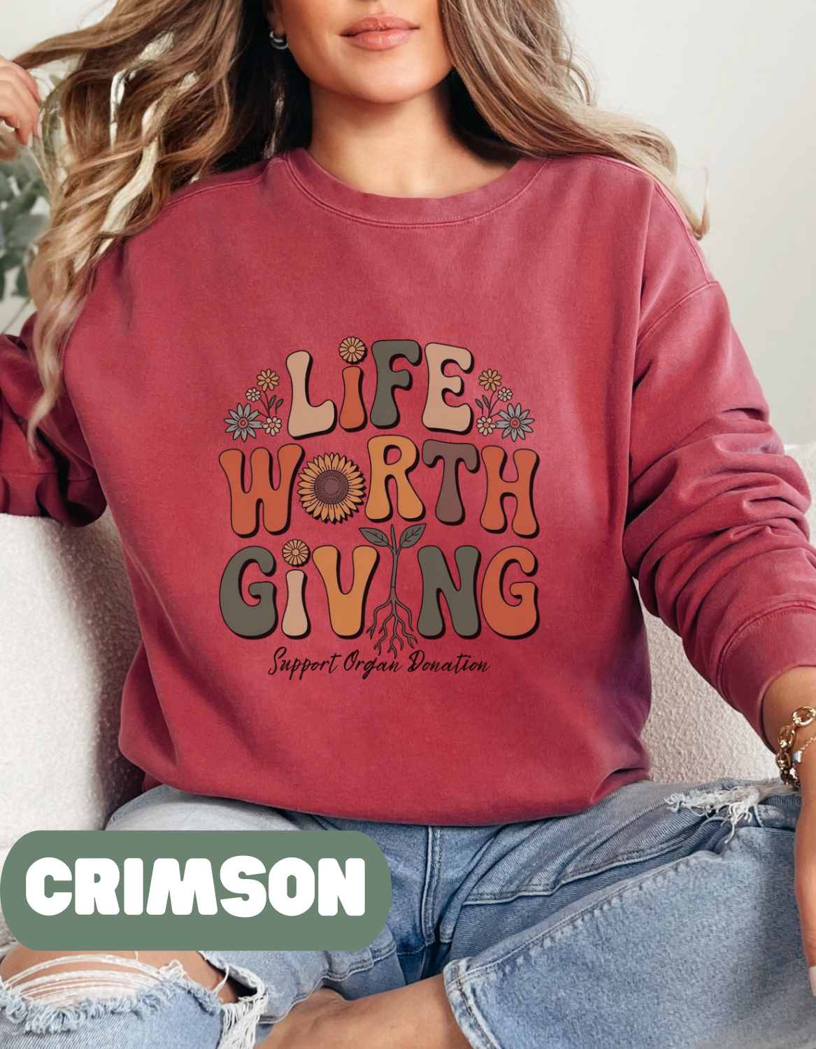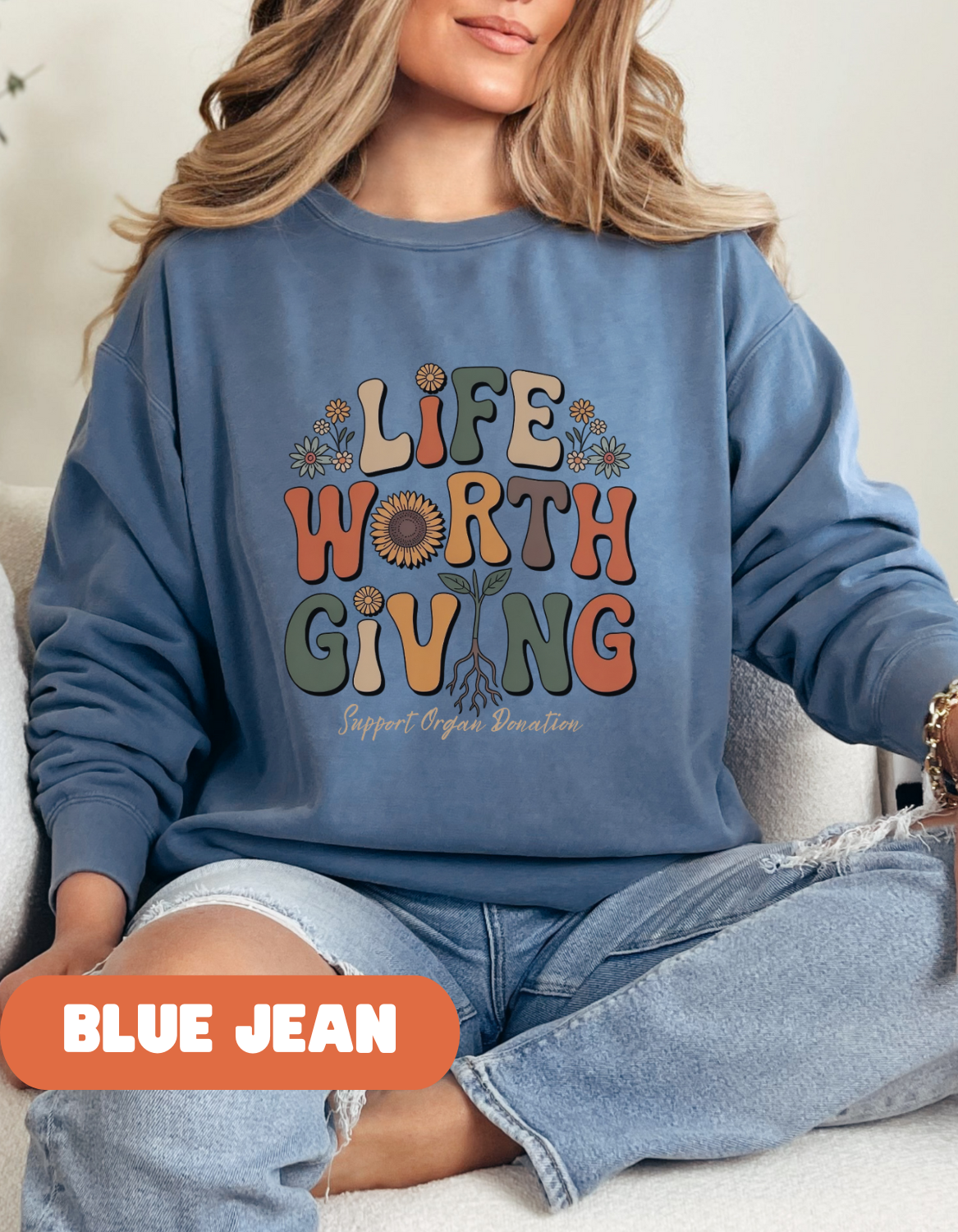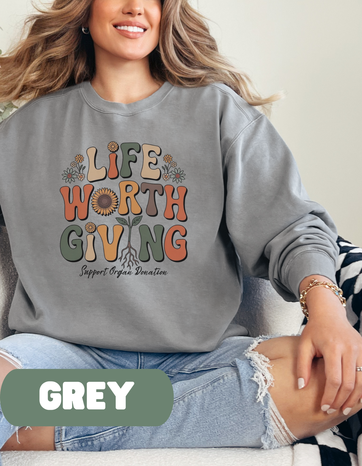 Wrap yourself in purpose with our Life Worth Giving Comfort Colors® sweatshirt — a cozy, boho-inspired tribute to organ donation. Featuring a vintage floral design and a message of hope, this unisex pullover honors transplant warriors, living donors, recipient families, and all who advocate for the gift of life.