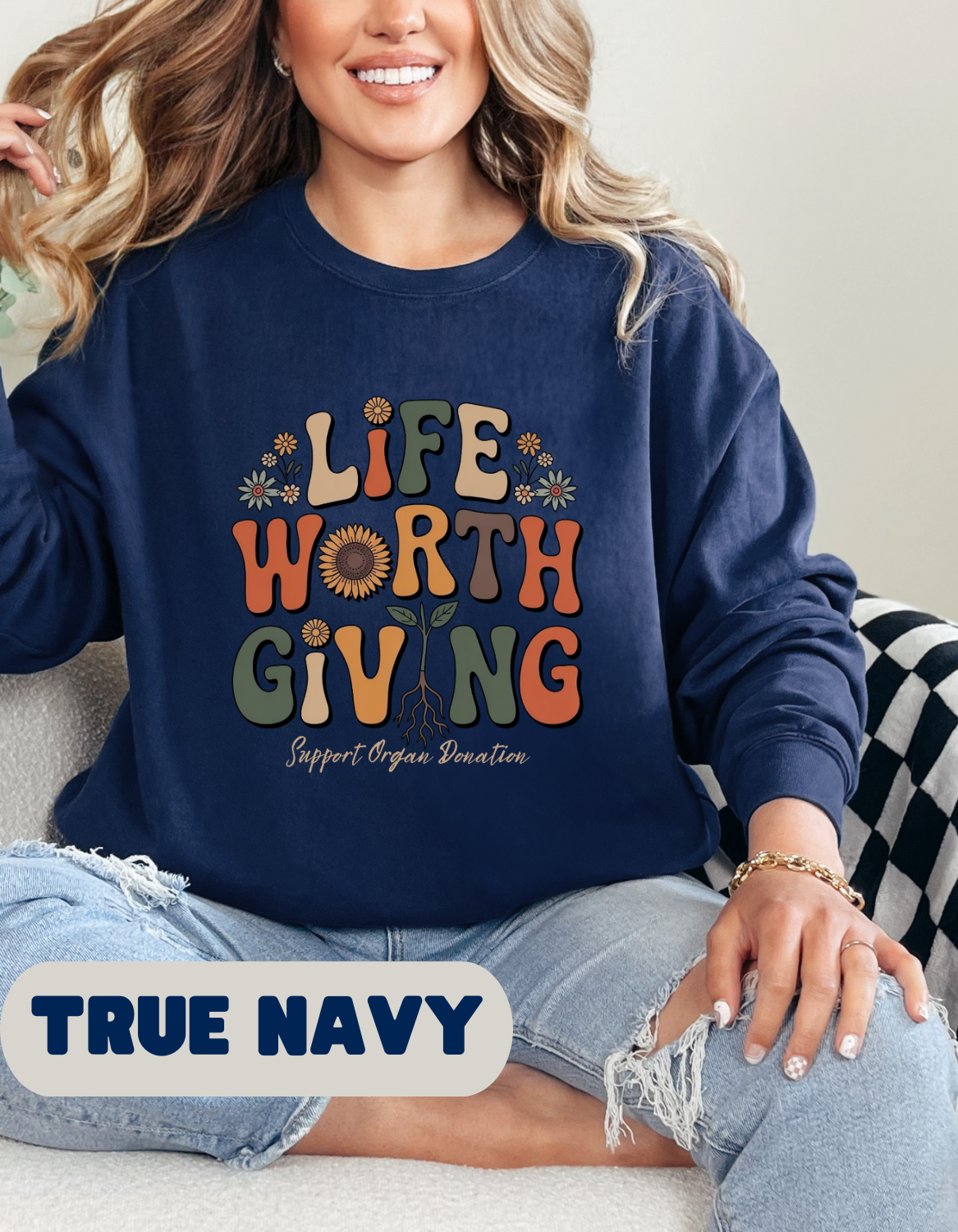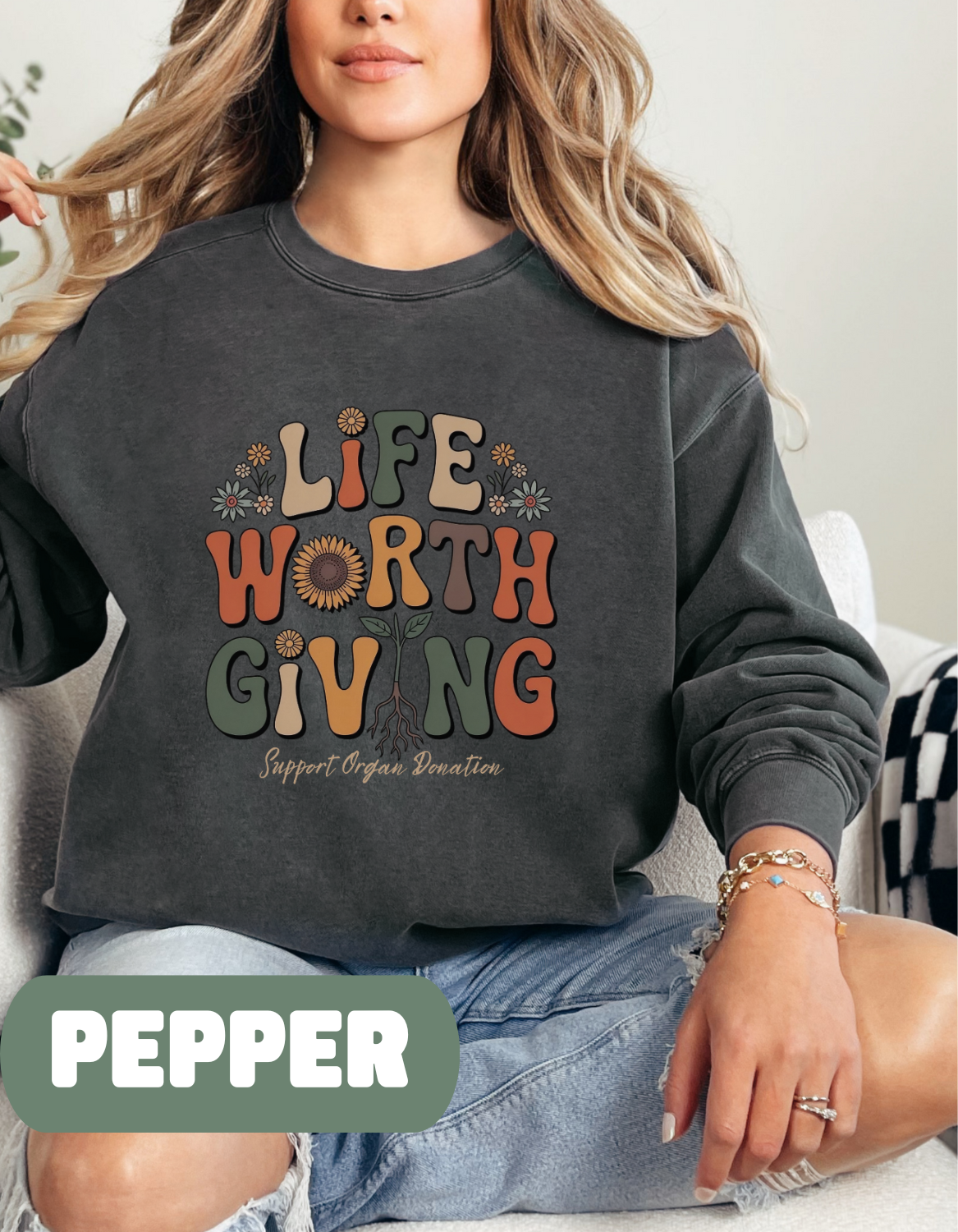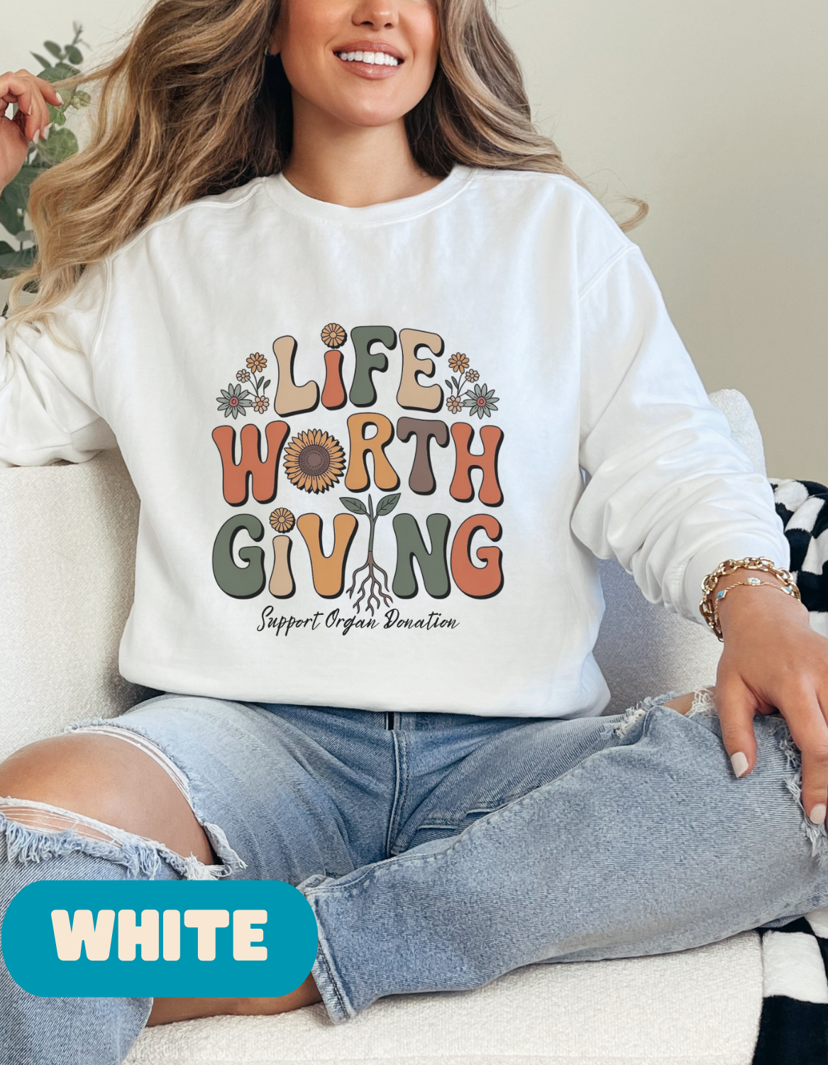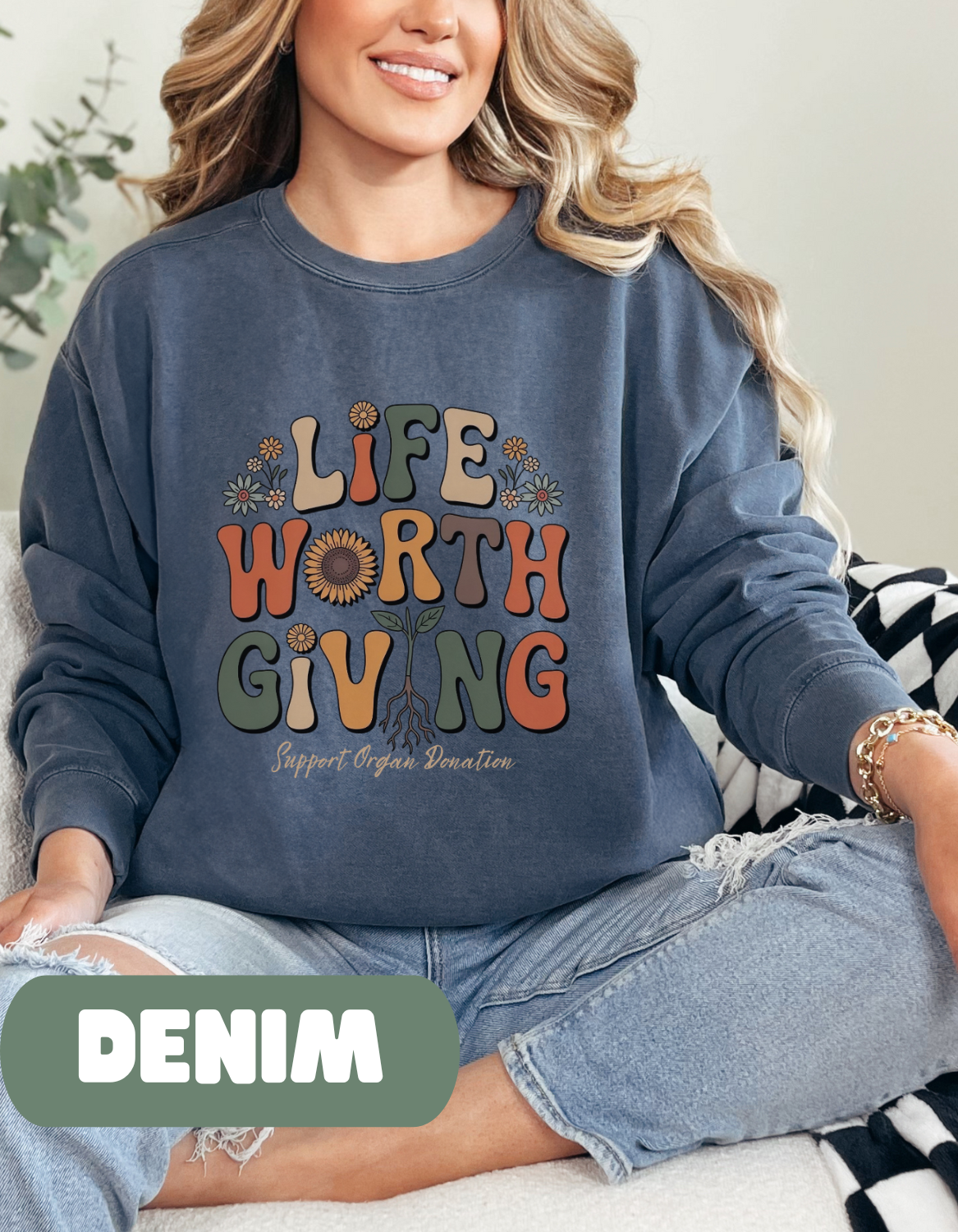 Wrap yourself in purpose with our Life Worth Giving Comfort Colors® sweatshirt — a cozy, boho-inspired tribute to organ donation. Featuring a vintage floral design and a message of hope, this unisex pullover honors transplant warriors, living donors, recipient families, and all who advocate for the gift of life.