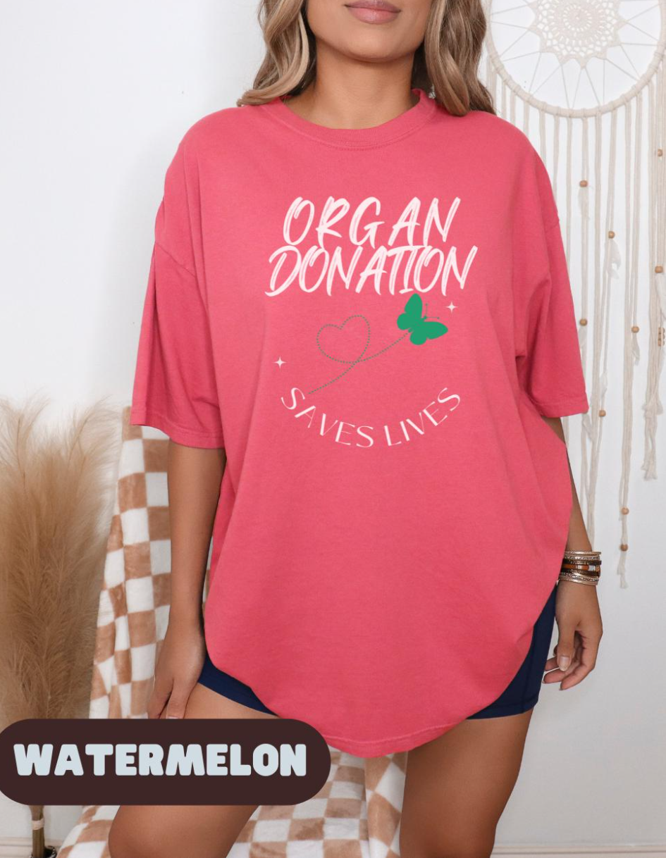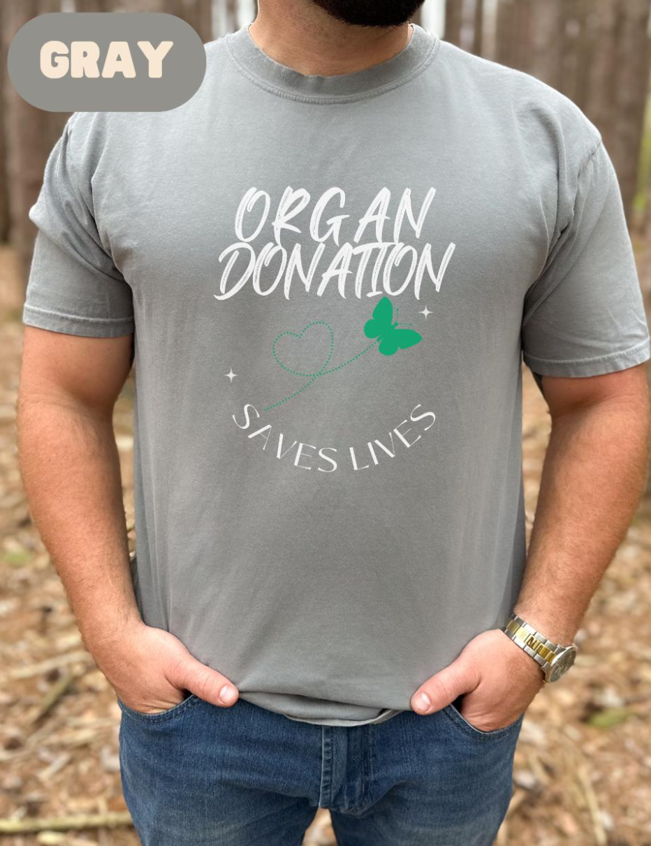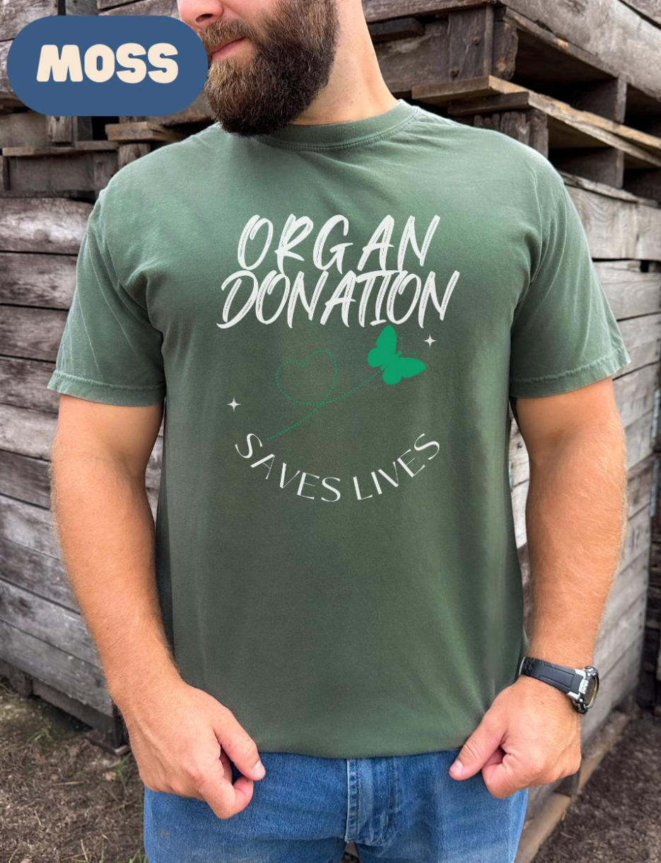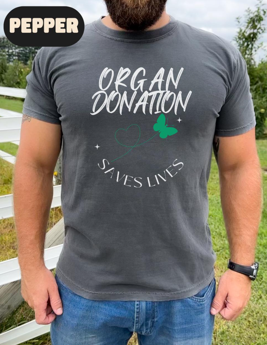 Our “Organ Donation Saves Lives” Comfort Colors® tee features a graceful butterfly flying free—a symbol of transformation, hope, and the life-giving gift of organ donation.